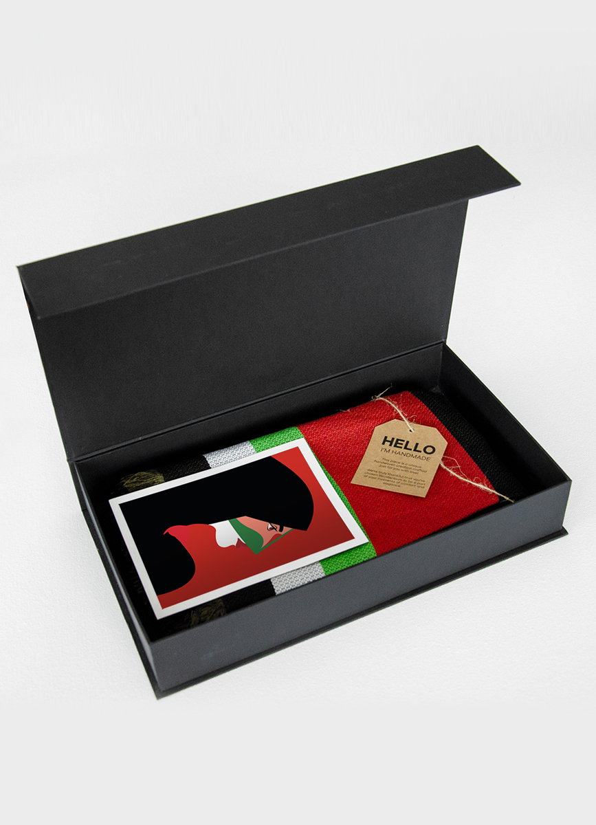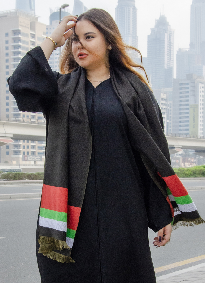 The “UAE Scarf Black Edition” is a handcrafted piece of timeless elegance, woven from a soft blend of silk and cotton. Designed to honor the nation’s spirit, it features the colors of the UAE flag, a symbol of unity, pride, and belonging. Each scarf is meticulously made on traditional looms, reflecting the finesse and precision of skilled artisans. Durable and unique, it carries the essence of authenticity that stands apart from commercial production. This limited-edition creation is made to be cherished and passed from generation to generation, a heartfelt tribute to craftsmanship, culture, and the enduring beauty of giving.